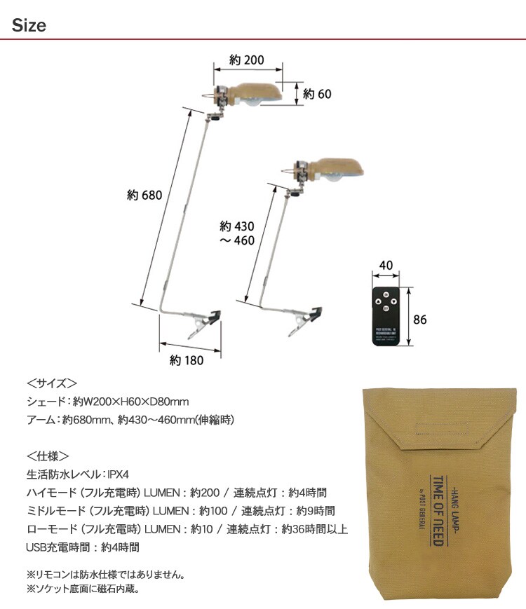 ハイモード(フル充電時)LUMEN : 約200 / 連続点灯 : 約4時間