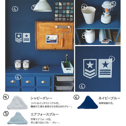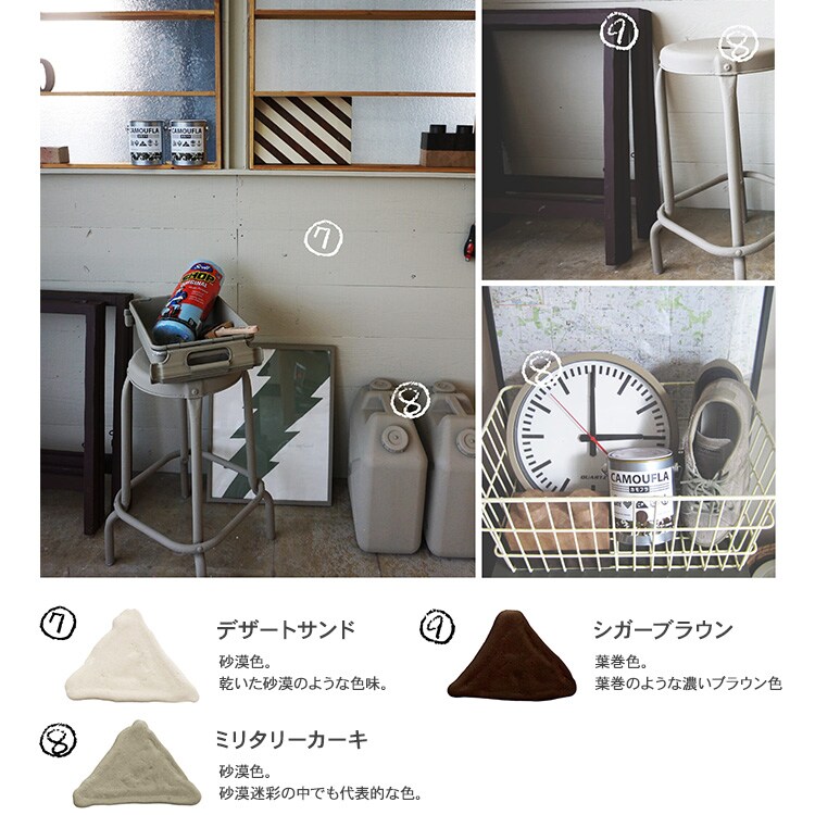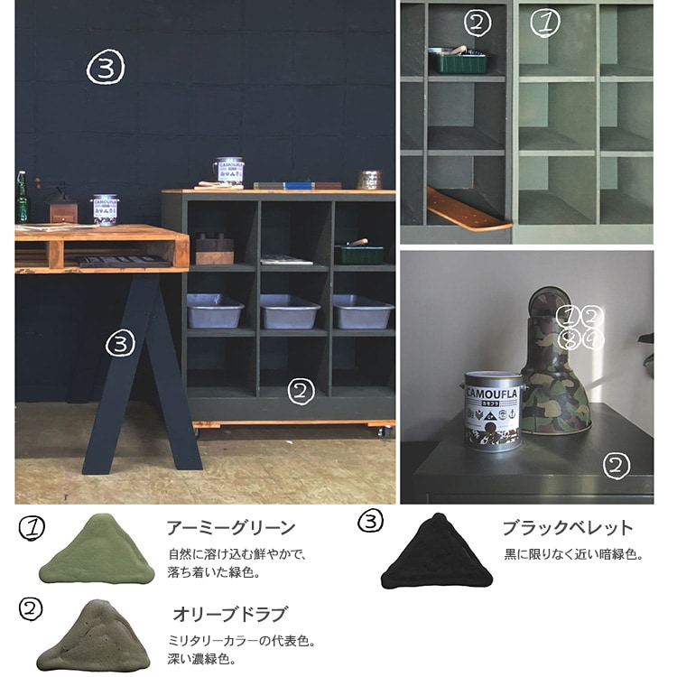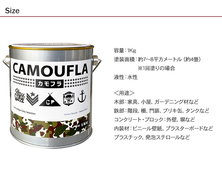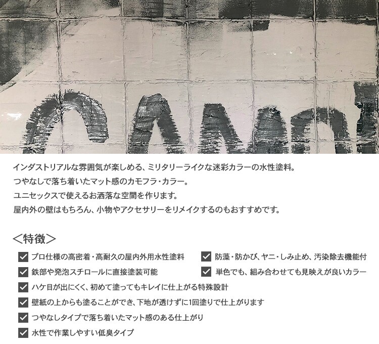 商品説明:インダストリアルな雰囲気が楽しめる、ミリタリーライクな迷彩カラーの水性塗料。