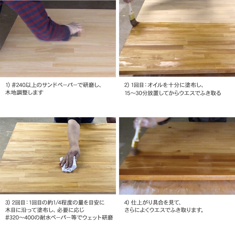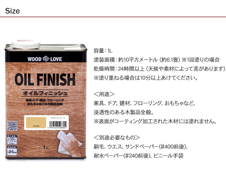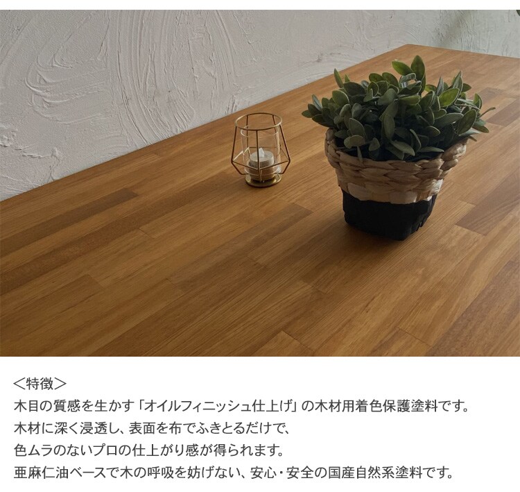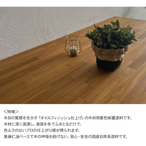 木材に深く浸透し、表面を布でふきとるだけで、色ムラのないプロの仕上がり感が得られます。