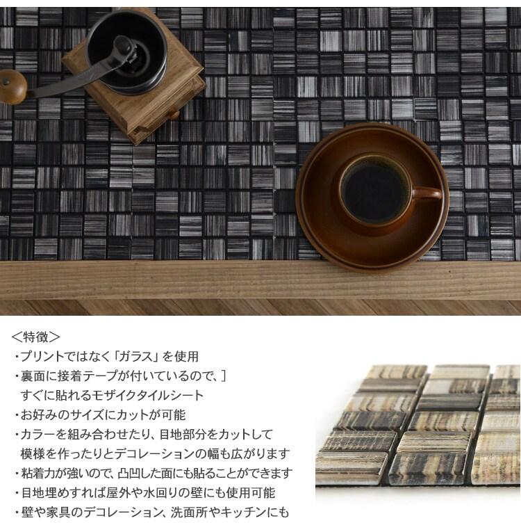 ・裏面に接着テープが付いているので、裏紙をは剥がすだけですぐに貼れるモザイクタイルシート。