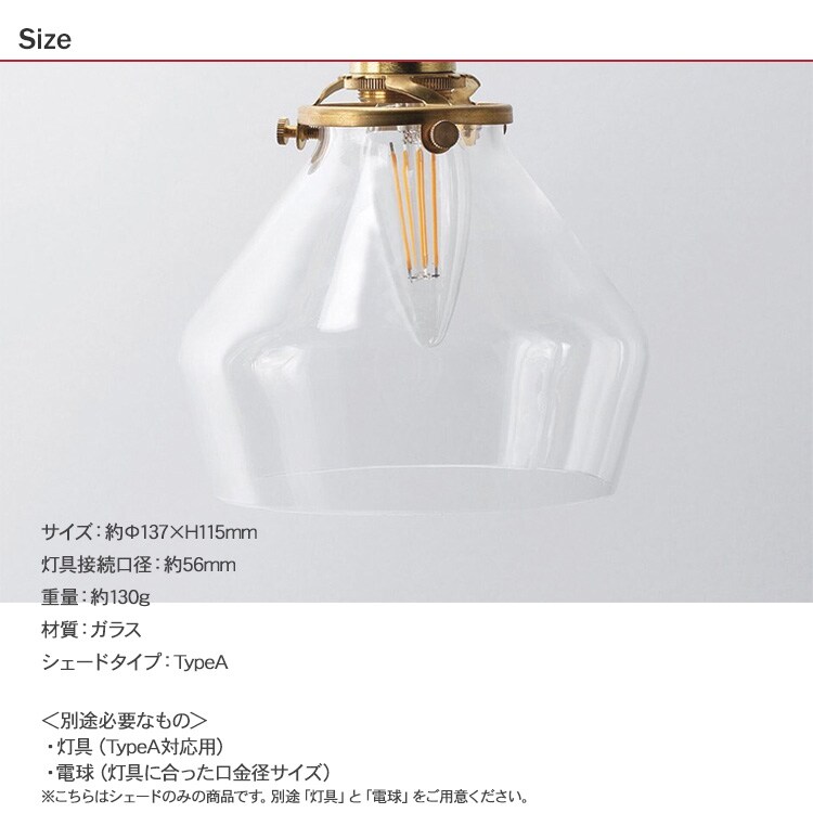 サイズ:約Φ137×H115mm、灯具接続口径:約56mm、重量:約130g、材質:ガラス