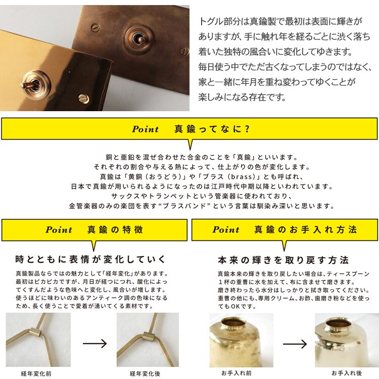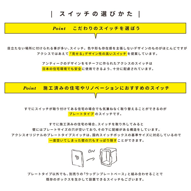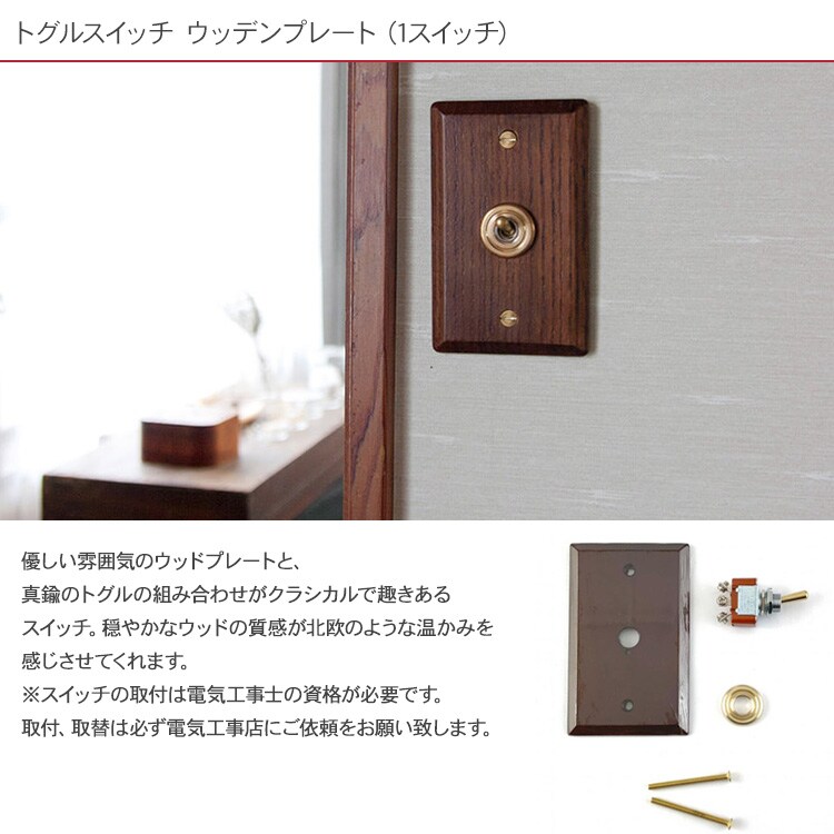 商品説明:優しい雰囲気のウッドプレートと、真鍮のトグルの組み合わせがクラシカルで趣きあるスイッチ。