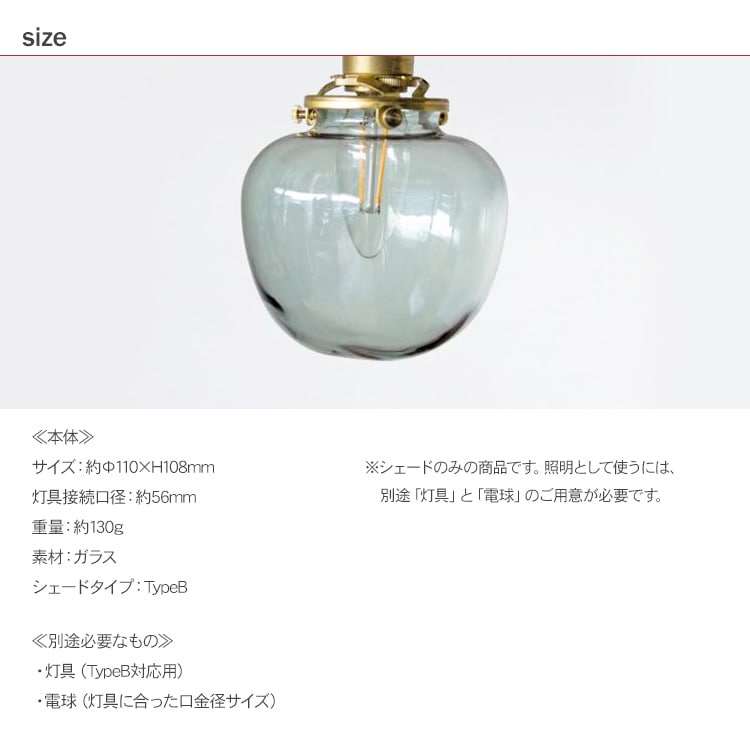 サイズ:約Φ110×H108mmmm、灯具接続口径:約56mm、重量:約130g、材質:ガラス