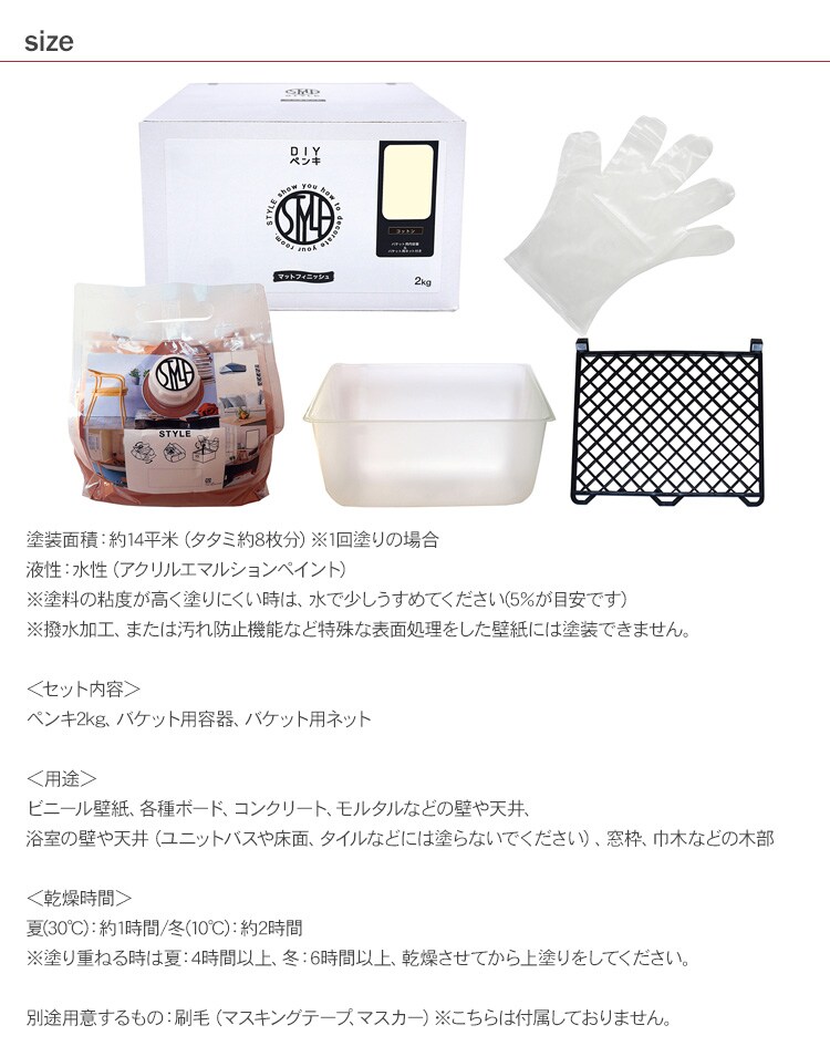 用途:ビニール壁紙、各種ボード、コンクリート、モルタルなどの壁や天井、浴室の壁や天井(ユニットバスや床面、タイルなどには塗らないでください)、窓枠、巾木などの木部