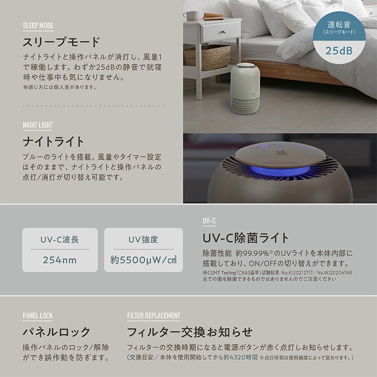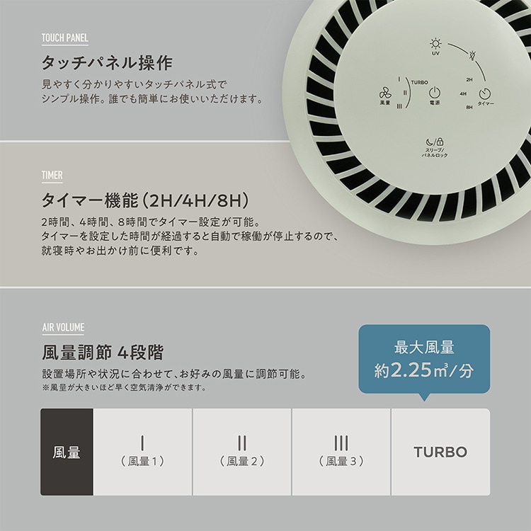 他機能:タッチパネル、スリープモード、ナイトライト、パネルロック、フィルター交換のお知らせ