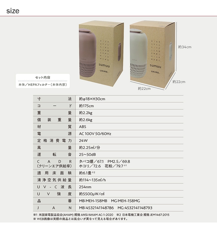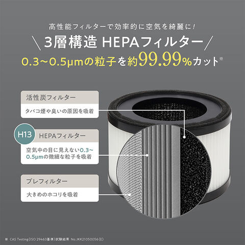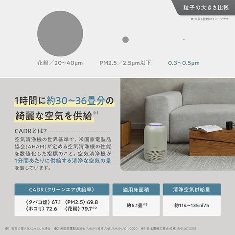 CADR(クリーンエア供給率):タバコ煙/67.1 PM2.5/69.8 ホコリ/72.6 花粉/79.7※米国家電製品協会(AHAM) 規格 ANSI/AHAM AC-1-2020