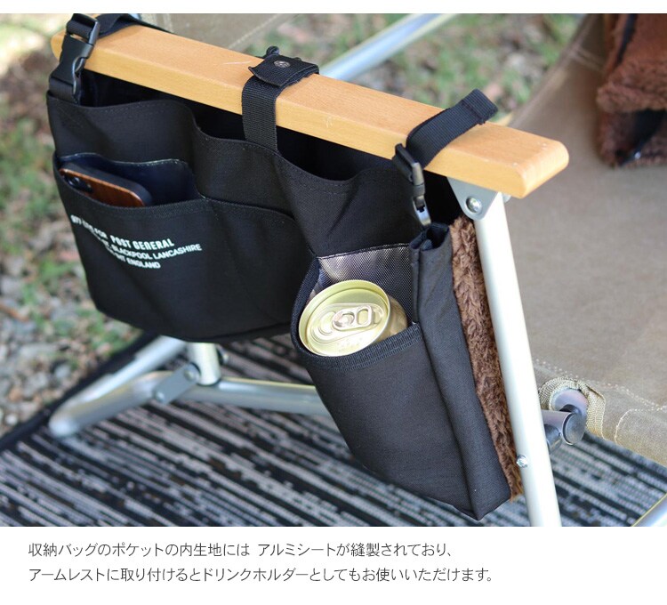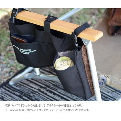 収納バッグのポケットの内生地には アルミシートが縫製されており、 アームレストに取り付けると ドリンクホルダーとしても使用できます。