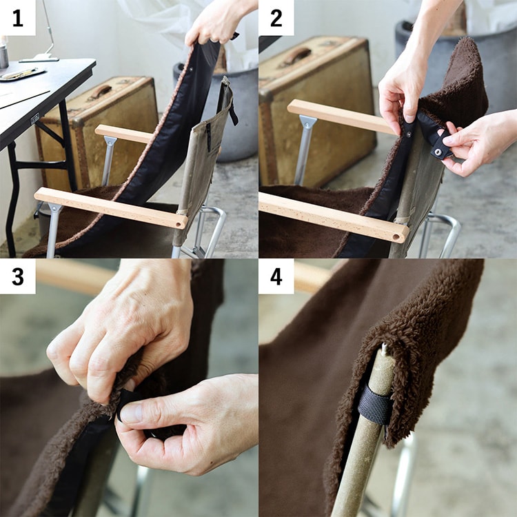 ブランケットと収納バッグはジッパーで繋がるため、 市販のチェアでも背面収納としてお使いいただけます。