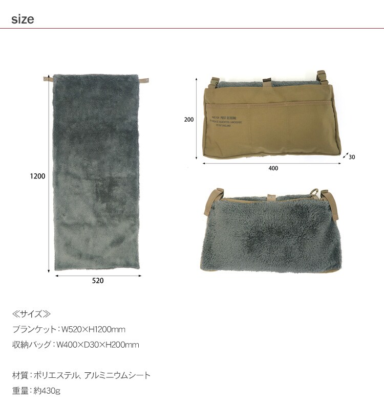 サイズ:ブランケット(W520×H1200mm)、収納バッグ(W400×D30×H200mm)