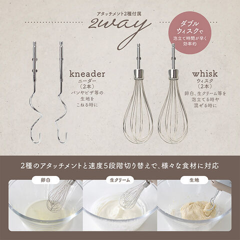 セット内容:本体、アタッチメント2種(ウィスク:2本、ニーダー:2本)