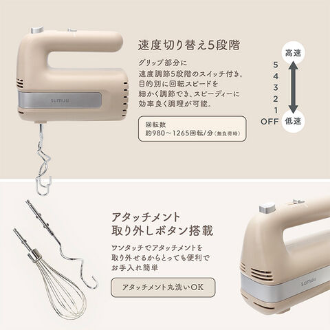 2種のアタッチメントと、速度5段階切り替えで、様々な食材に対応します。