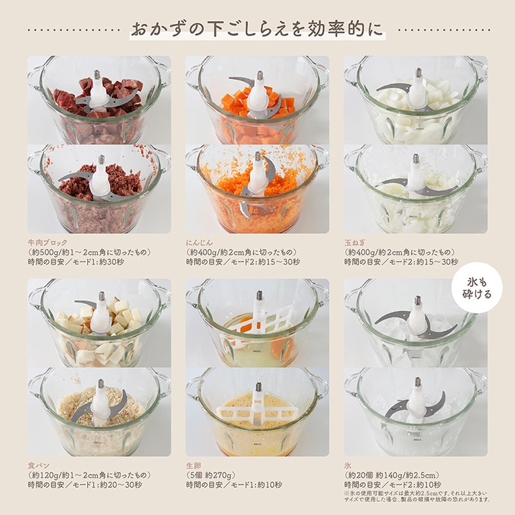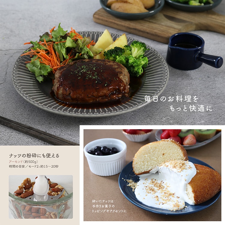 「刻む」「ミンチ」「混ぜる」「攪拌」ができるフードプロセッサーです。