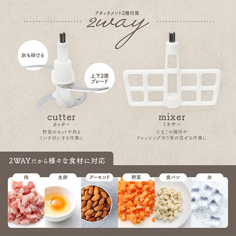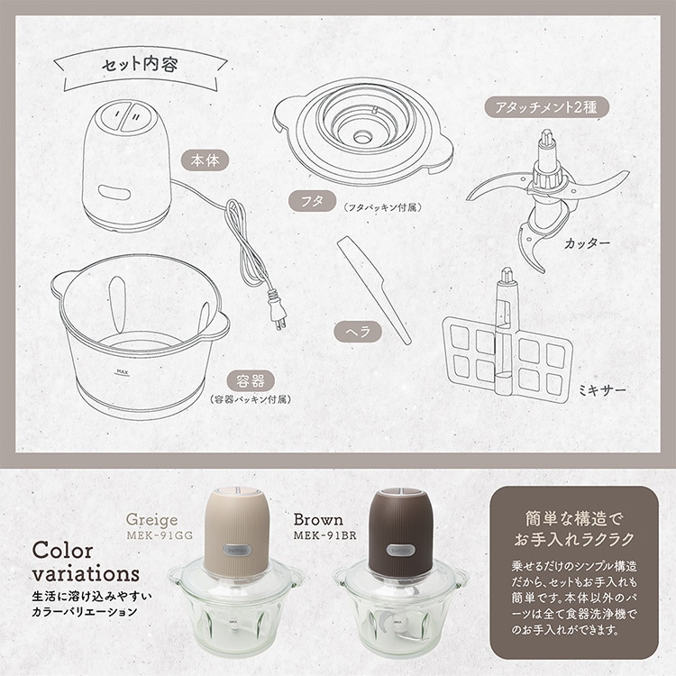 セット内容:本体、容器(容器パッキン付属)、フタ(フタパッキン付属)、ヘラ、アタッチメント2種(カッター、ミキサー)
