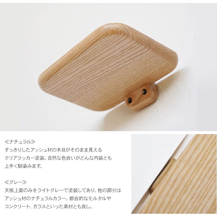 グレーは、天板上面のみをライトグレーで塗装してあり、他の面はすっきりしたアッシュ材のナチュラルカラー。都会的なモルタルやコンクリート、ガラスといった素材とも良し。