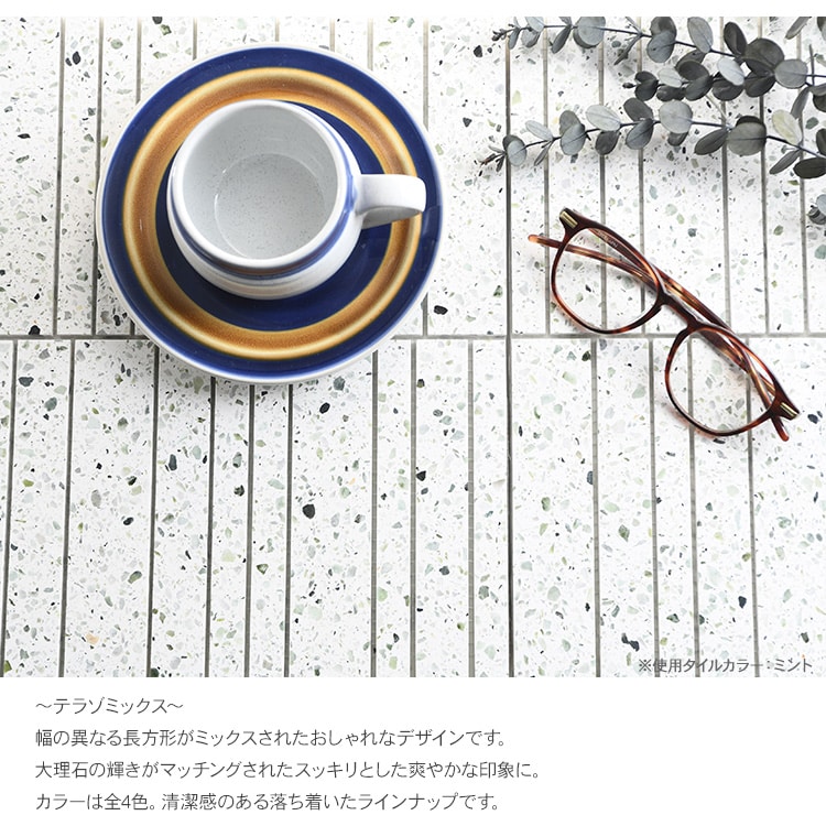 ・裏面に接着テープが付いているので、裏紙をは剥がすだけですぐに貼れるモザイクタイルシート。
