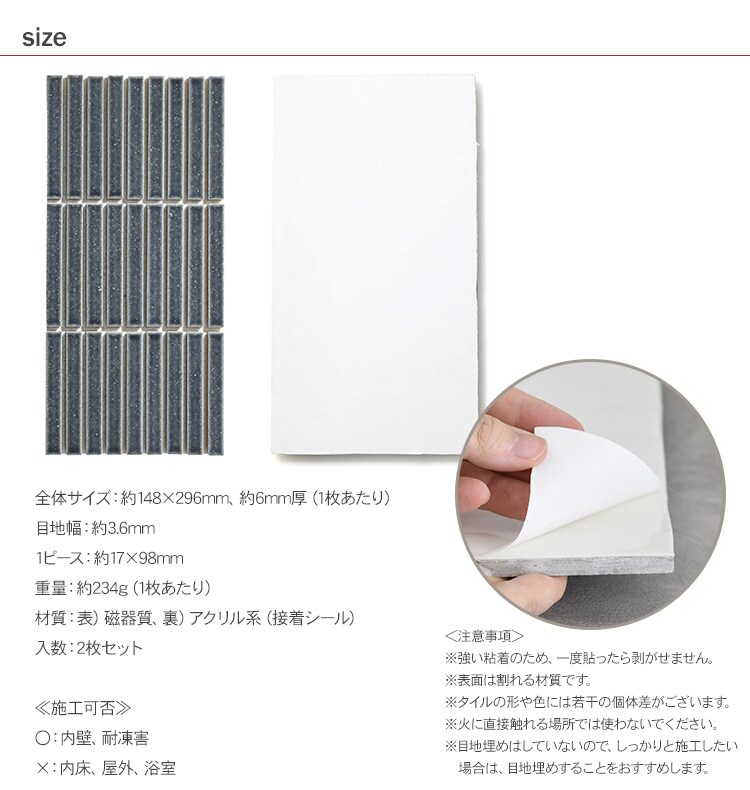 ※粘着シートとタイルが剥がれてしまわないように、貼る前にシートにタイルを押し付けるように圧着し、壁に貼った後も再度タイルを押し付けるように圧着してください。さらにその上から目地埋めすることで強度が強化されます。