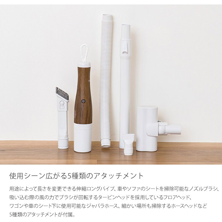 どこでも持ち運べるコードレス&5種類のアタッチメント付き。