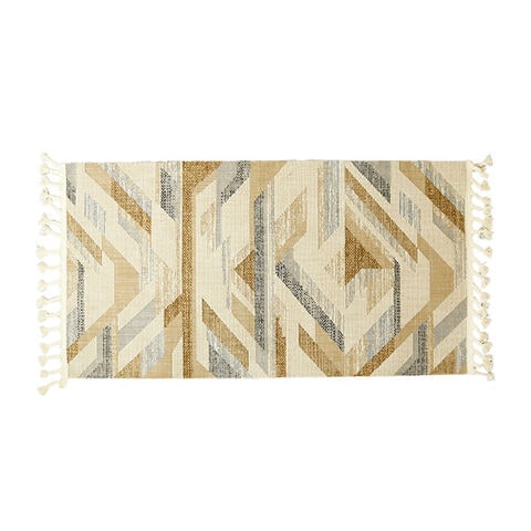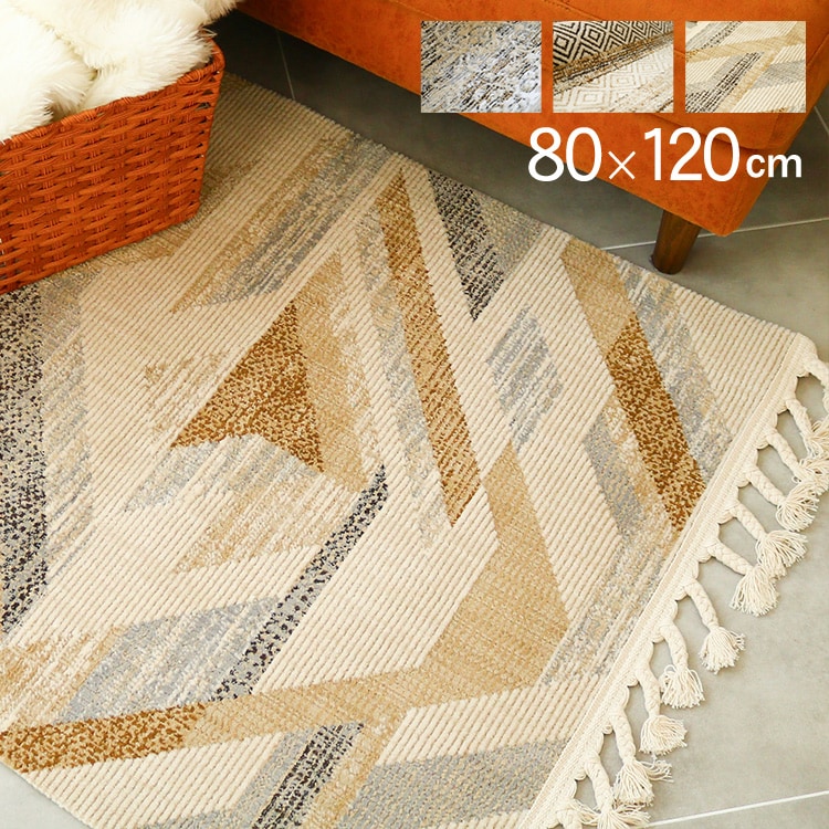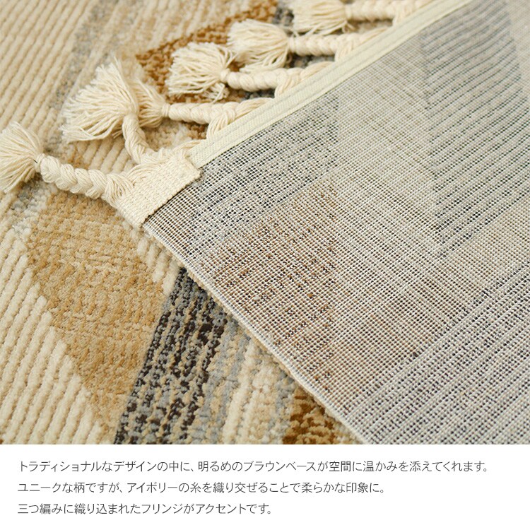 ユニークな柄ですが、アイボリーの糸を織り交ぜることで柔らかな印象に。三つ編みに織り込まれたフリンジがアクセントです。