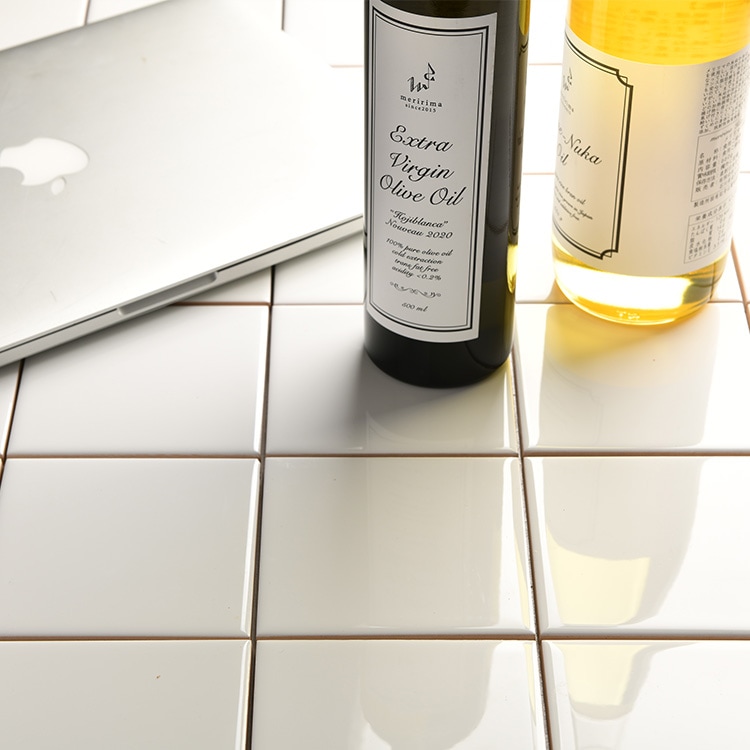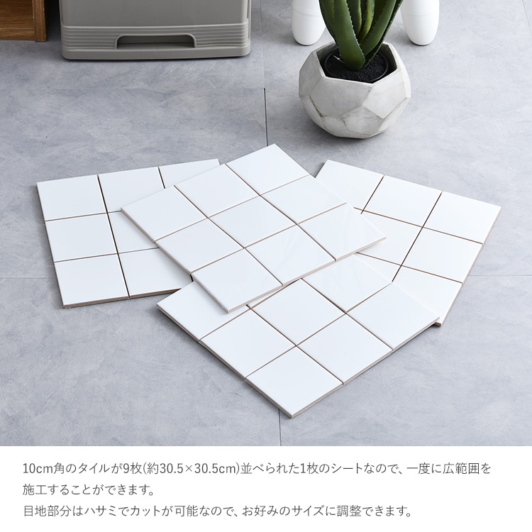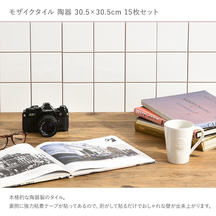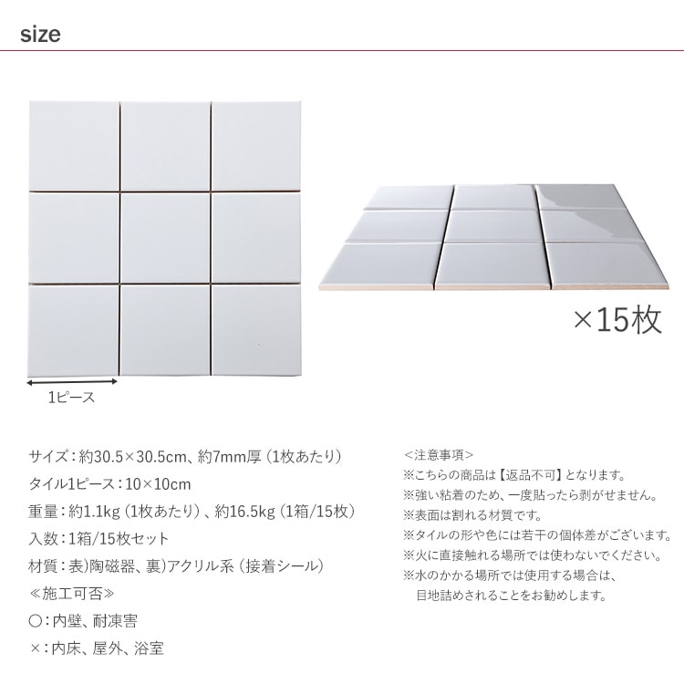 裏テープ付き 100角壁タイル 1箱(15枚) ホワイト _PP02 陶磁器 タイルシール 壁 キッチンタイル カフェ 店舗 レストラン リビング 寝室 玄関 テーブル 洗面台 トイレ DIY 100角 室内 北欧 インテリア