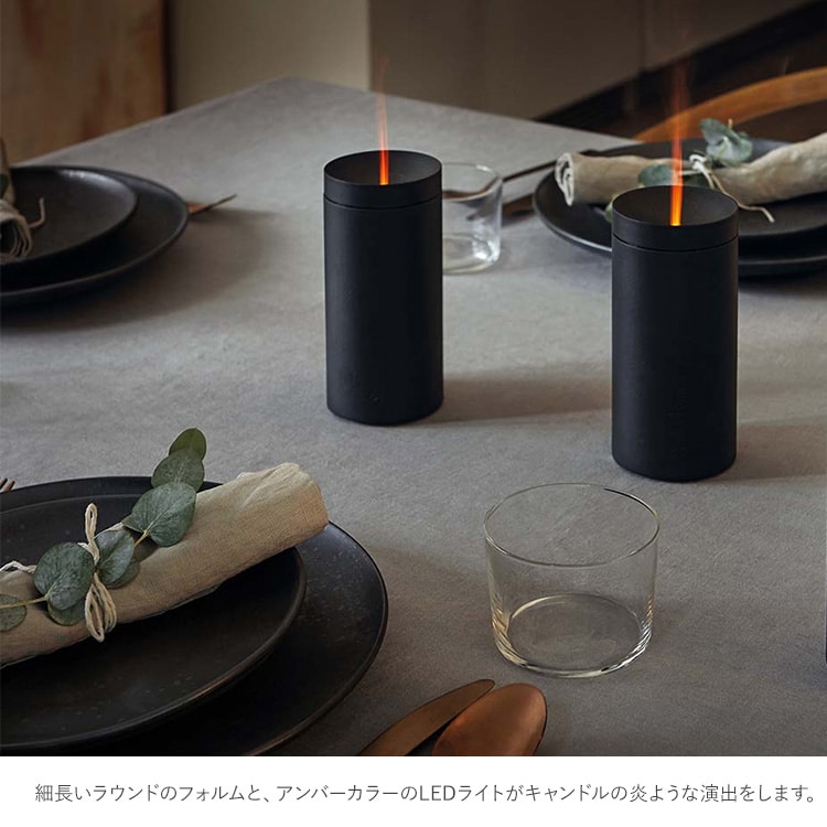 細長いラウンドのフォルムと、アンバーカラーのLED ライト がキャンドルの炎ような演出をします。