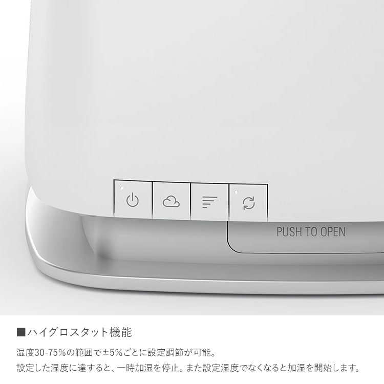 わかりやすいディスプレイと簡単な操作性はもちろん、自動湿度調整機能やアロマディフューザーとしての機能など充実の機能を搭載。