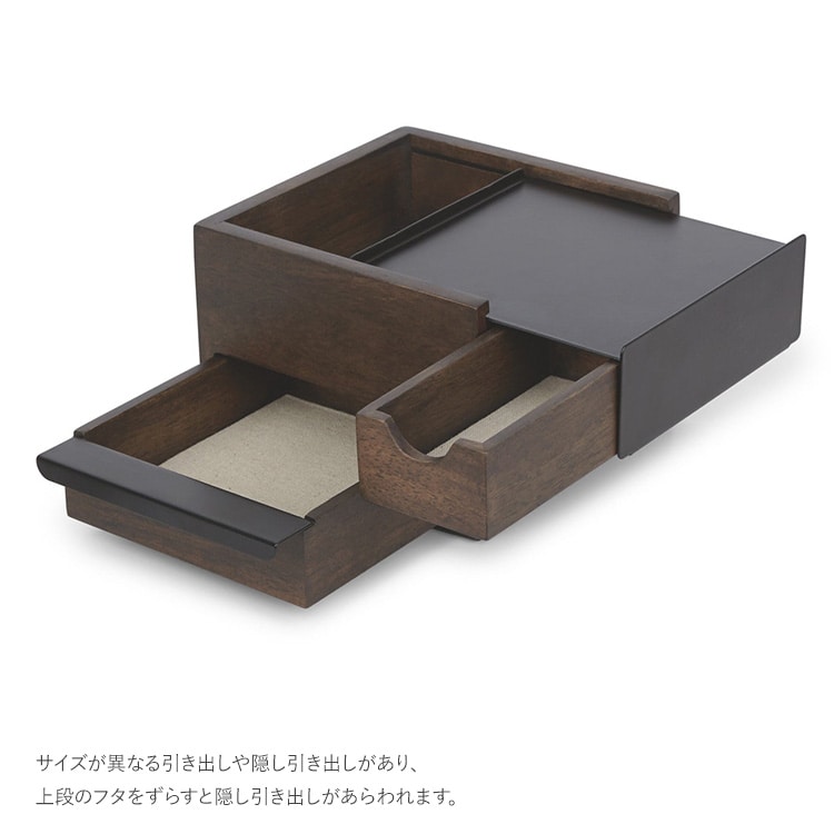 サイズが異なる引き出しや隠し引き出しがあり、上段のフタをずらすと隠し引き出しがあらわれます。