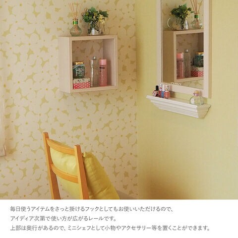 壁にレールを取り付けて、お気に入りアイテムを飾ってディスプレイを楽しめます。