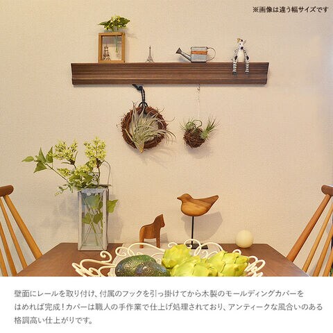壁面にレールを取り付け、付属のフックを引っ掛けてから木製のモールディングカバーをはめれば完成!