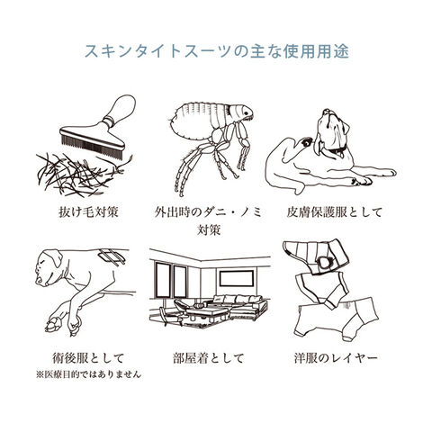 換毛期の抜け毛や皮膚のトラブル時など飼い主の悩みを解決してくれるスキンタイトスーツ。