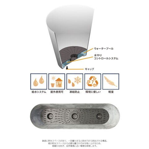 独自の排水・吸水システムにより、直植えの自然環境に近い状態を保つことのできる便利なプランターです。