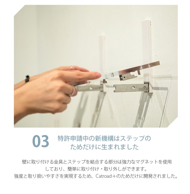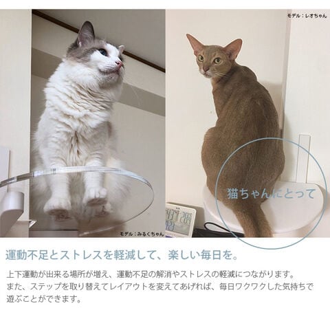 取り付けた後でも、猫ちゃんの気分やお部屋のレイアウトに合わせてステップを組み換え、DIY感覚で自由にワクワク空間を作り出すことができます。