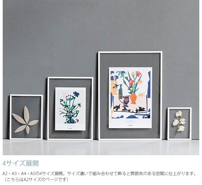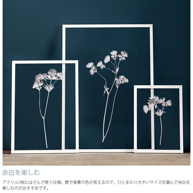 アクリル2枚にはさんで使う仕様。壁や背景の色が見えるので、ひとまわり大きいサイズを選んで余白を楽しむのがおすすめです。