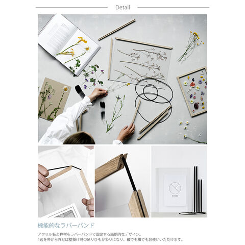 アクリル板と枠材をラバーバンドで固定する画期的なデザイン。1辺を枠から外せば壁掛け時の吊りひもがわりになり、縦でも横でもお使いいただけます。