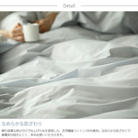 綿の良質な部分だけで仕上げた糸を使用した、天然繊維コットン100%素材。なめらかな肌ざわりで静電気が起きにくく、年中お使いいただけます。