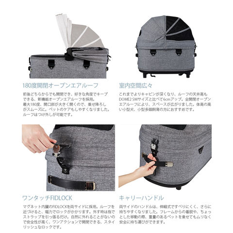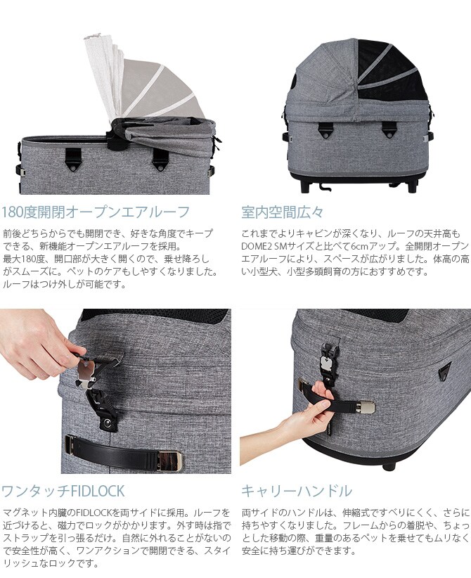 使いやすい180°オープンエアールーフを採用したDOME3シリーズ。 DOME2シリーズ SMサイズと比べて天井高が6㎝アップし内部空間もより広く。体高の高い小型犬、小型多頭飼育の方におすすめです。