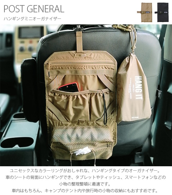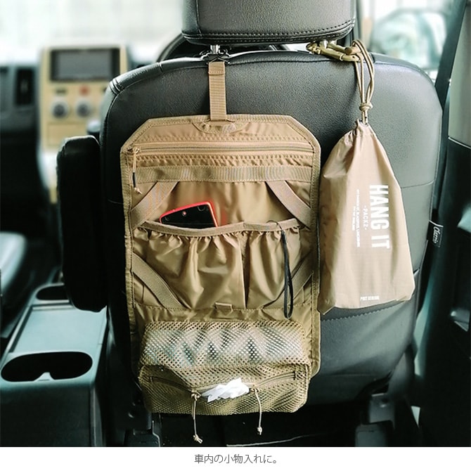 車のシートの背面にハンギングでき、タブレットやティッシュ、スマートフォンなどの小物の整理整頓に最適です。