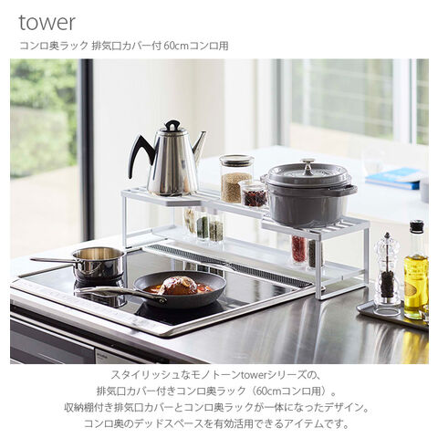 ■備考:スタイリッシュなモノトーンtowerシリーズの、排気口カバー付きコンロ奥ラック(60cmコンロ用)。