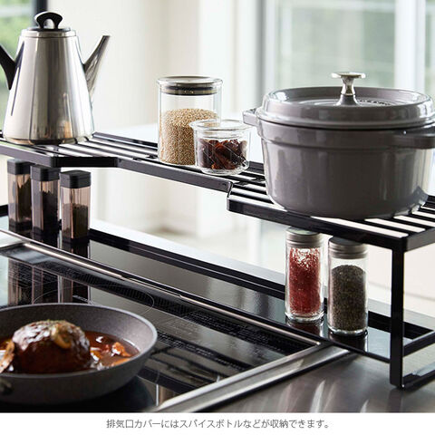 収納棚付き排気口カバーとコンロ奥ラックが一体になったデザイン。