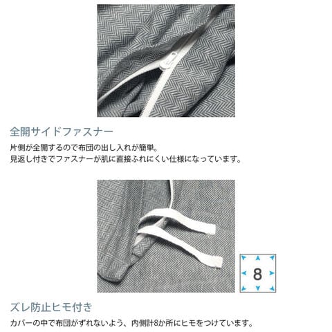 片側が全開するので布団の出し入れが簡単。見返し付きでファスナーが肌に直接ふれにくい仕様になっています。