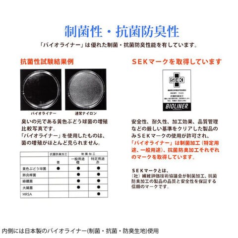 ・内側には日本製のバイオライナー(制菌・抗菌・防臭生地)使用