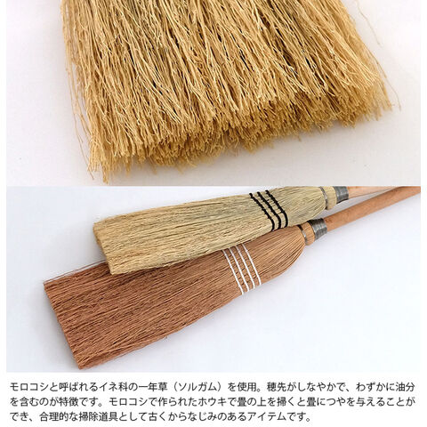 ・モロコシと呼ばれるイネ科の一年草(ソルガム)を使用。穂先がしなやかで、わずかに油分を含むのが特徴です。モロコシで作られたホウキで畳の上を掃くと畳につやを与えることができ、合理的な掃除道具として古くからなじみのあるアイテムです。