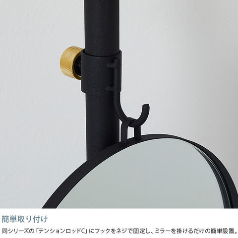 同シリーズの「テンションロッドC」にフックをネジで固定し、ミラーを掛けるだけの簡単設置。
