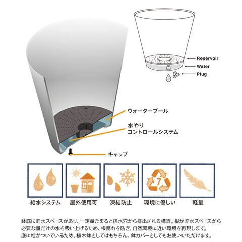 ・鉢底に貯水スペースがあり、一定量たまると排水穴から排出される構造。根が貯水スペースから必要な量だけの水を吸い上げるため、根腐れを防ぎ、自然環境に近い環境を再現します。