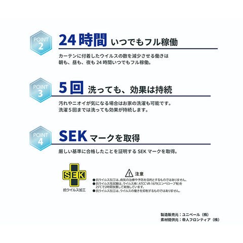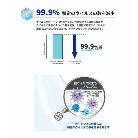 カーテン上に付着した特定のウイルスの数を減少させ、カーテンをクリーンに保ちます。