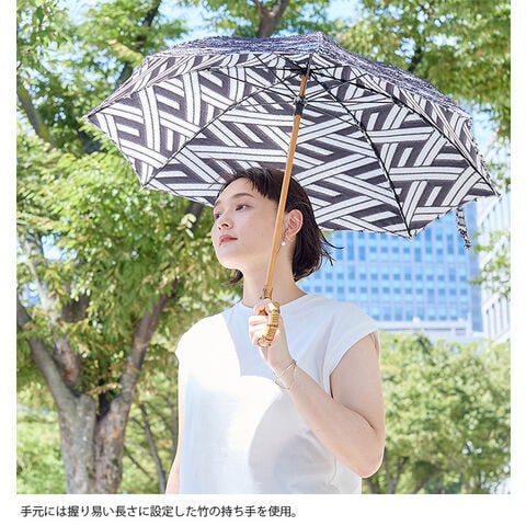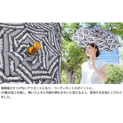 ・菱模様がさりげないアクセントになり、コーディネートのポイントに。UV撥水加工を施し、開いたときに内側の柄もきれいに見えるよう、使用する生地にこだわりました。