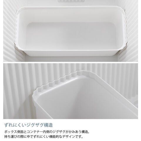 コンテナーとインナーボックスのジグザグ面がかみ合うことで、ずれにくくきれいに収まります。