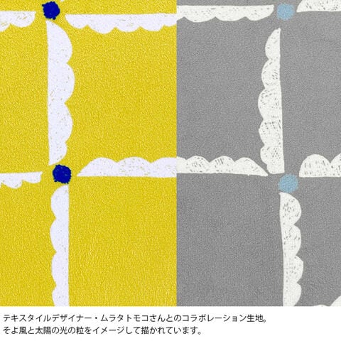 ・テキスタイルデザイナー・ムラタトモコさんとのコラボレーション生地。そよ風と太陽の光の粒をイメージして描かれています。