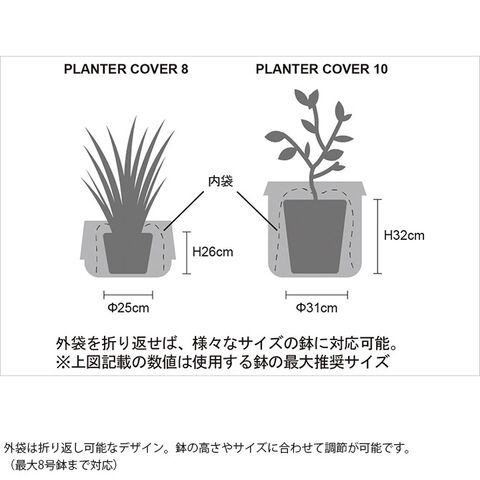 外袋の折り返し幅を調整することで、様々なサイズの鉢に対応可能。