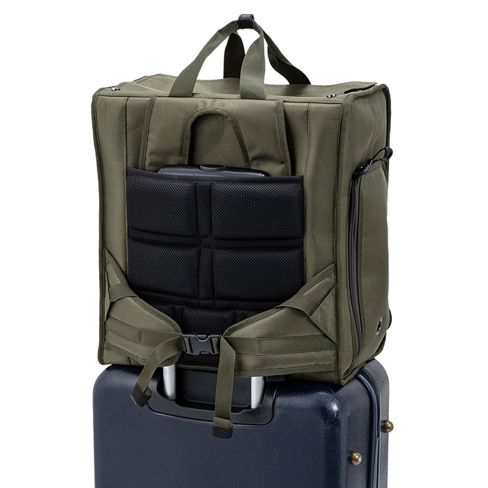 背面はスーツケースのハンドルに通してキャリーオンとしても使用できます。