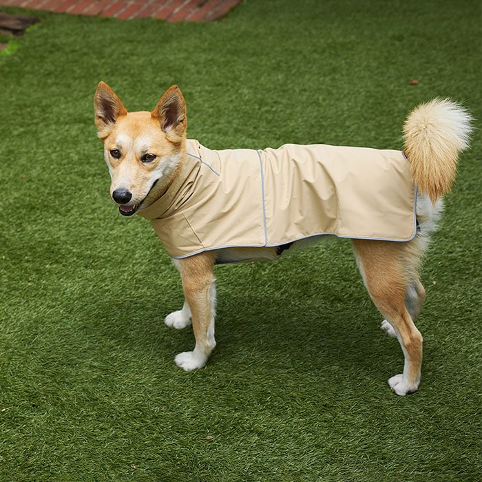 頭から被ってお腹を留めるだけ!脚付きが苦手なワンちゃんのためのレインウェア。